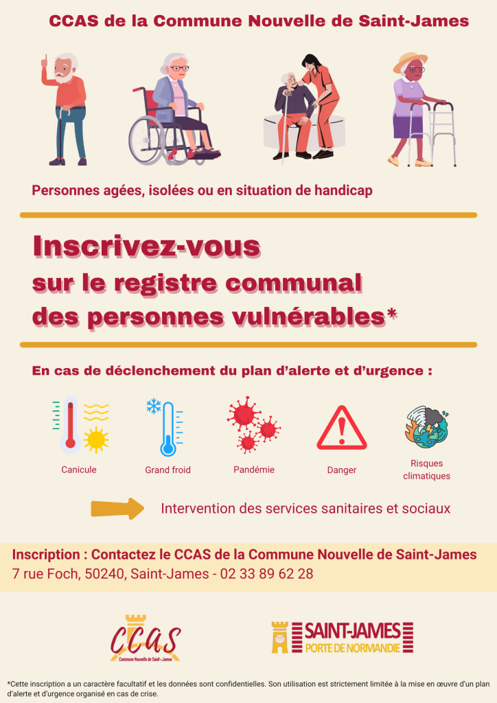 Les personnes qui souhaitent figurer sur ce registre et bénéficier ainsi du suivi mis en place par la Commune Nouvelle, sont invitées à contacter le CCAS au 02 33 89 62 05 ou à se rendre directement à La Maison des Citoyens située au 7 rue Foch à Saint-James.
